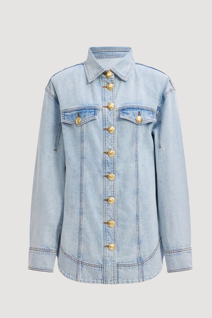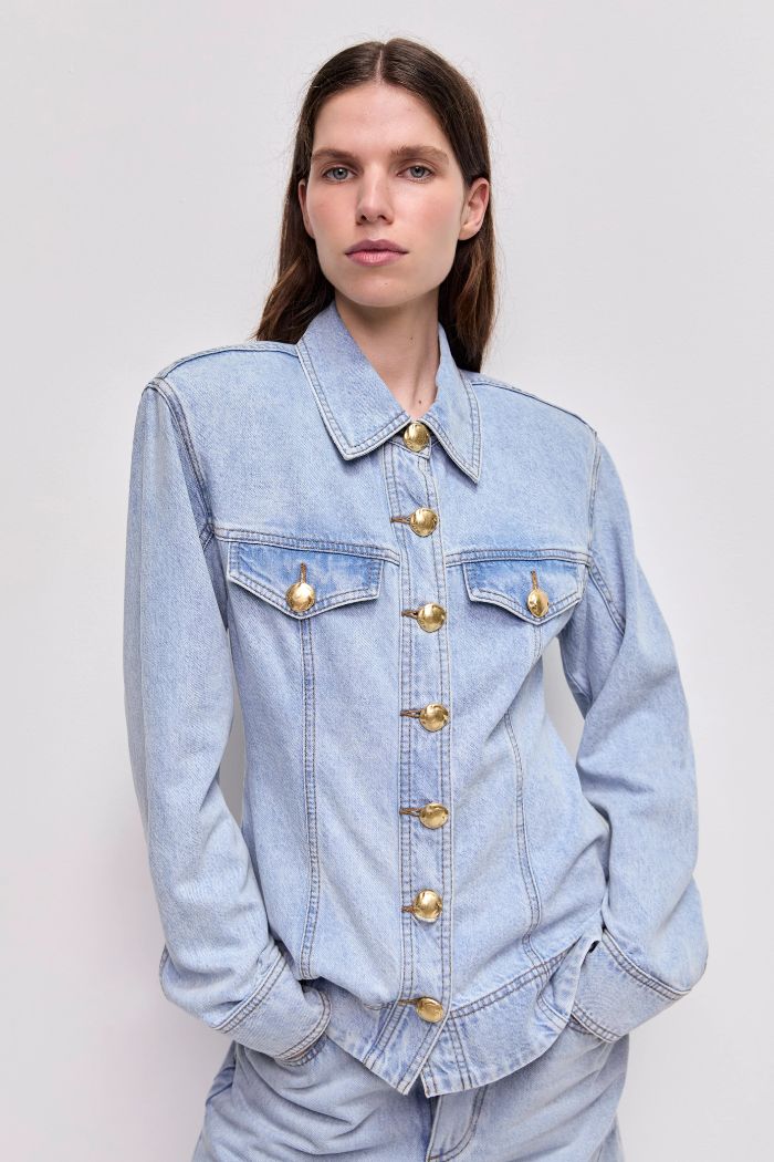 Denim Shirt with collar and gold feature button, Front placket with gold feature buttons, Fitted waist, Front patch pockets, Topstitching, Long blouson sleeves with cuffs, Vegan leather logo patch, Curved hem, lightly padded shoulders