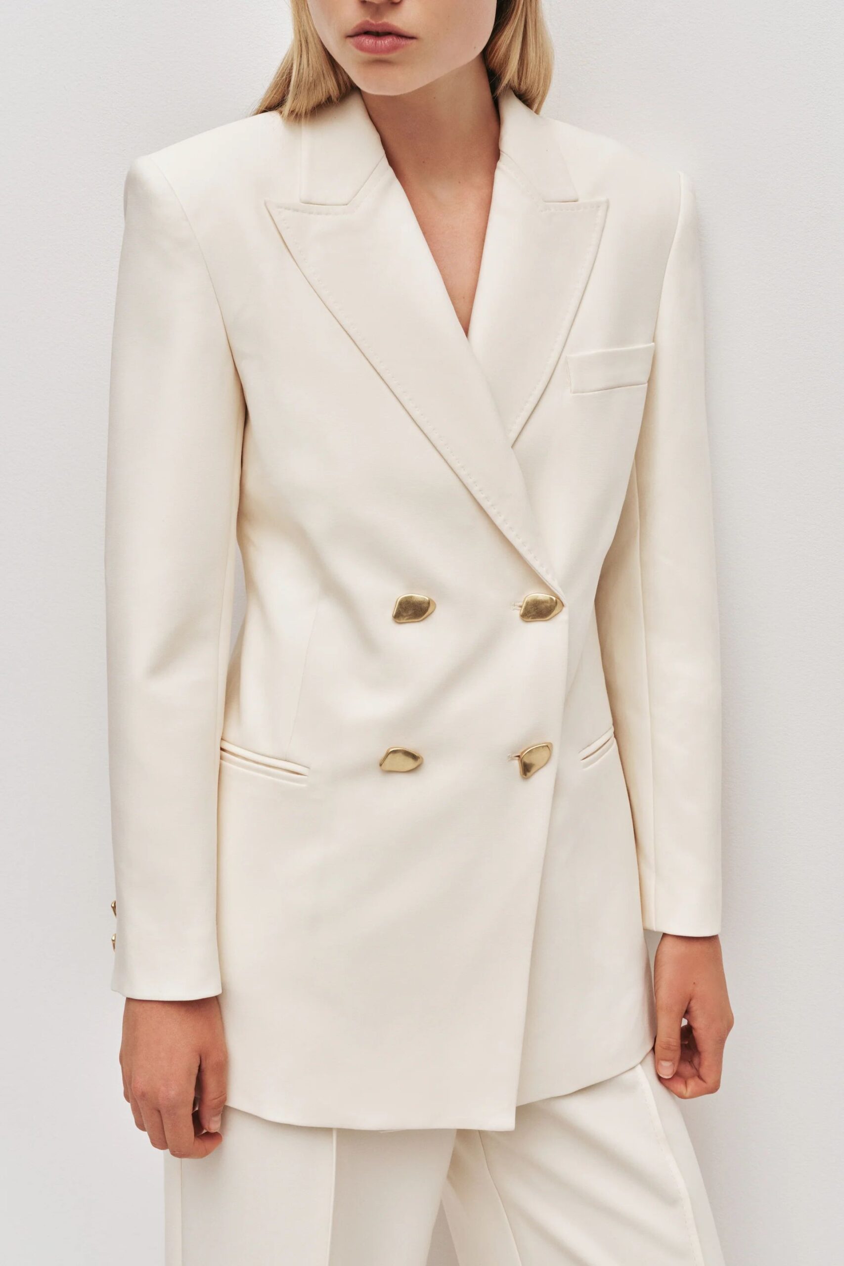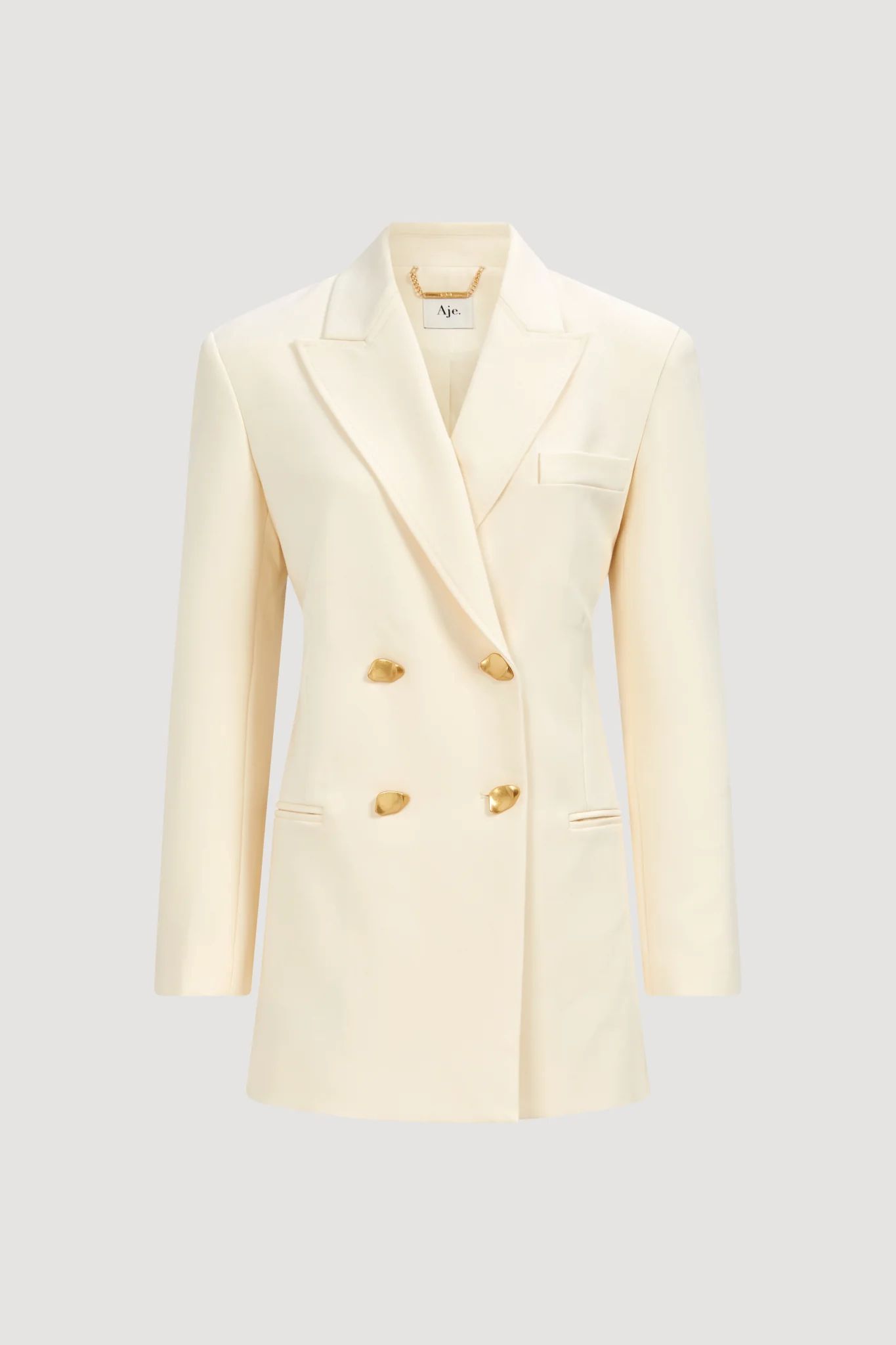 Crafted in a classic double-breasted style with statement buttons, it offers a polished yet effortless finish.