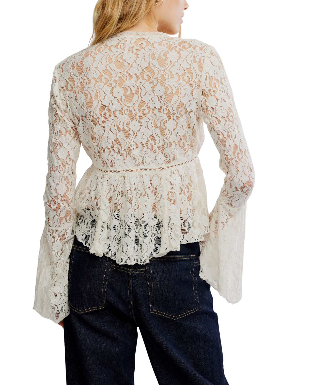 An ethereal piece with romantic charm, this lace blouse features a flowing peplum shape and dramatic bell sleeves for soft movement and texture.